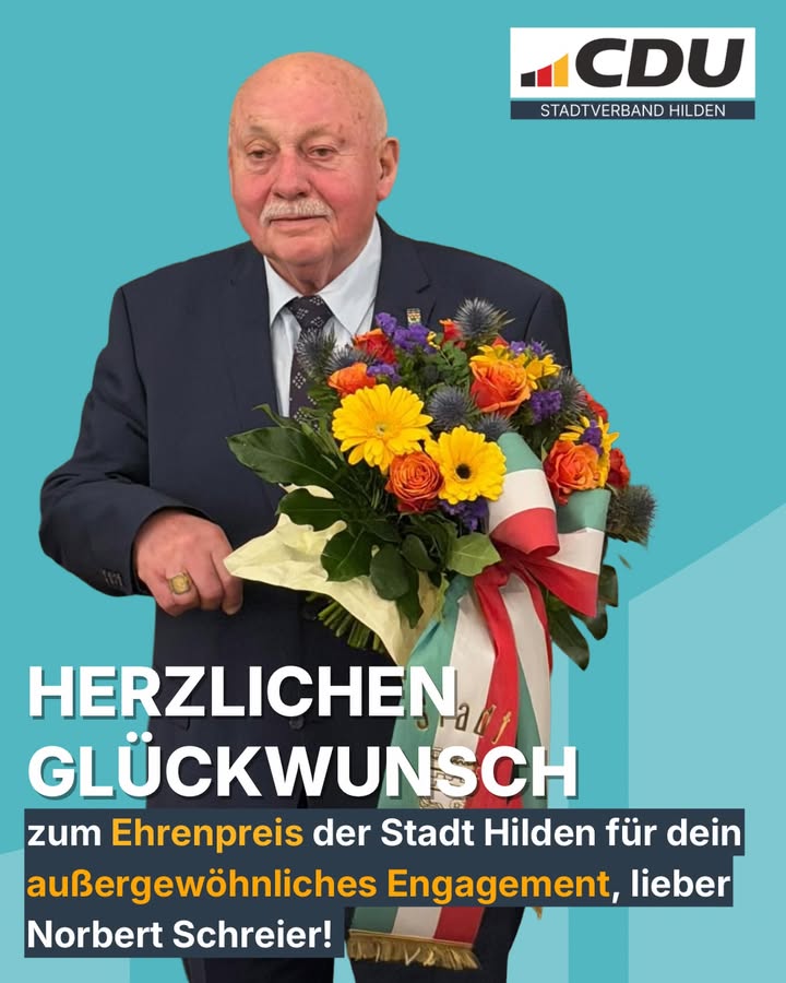 mehrHerzlichen Glückwunsch, Norbert Schreier! 👏Die CDU Hilden gratuliert Norbert Schreier herzlich zum Erhalt des Wappenrings in Gold, einer der höchsten Auszeichnungen der Stadt Hilden. Bürgermeister Claus Pommer verlieh ihm diese besondere Ehrung in der Stadthalle für 30 Jahre Ratsarbeit und 26 Jahre als stellvertretender Bürgermeister. 💪Seit 1979 engagierte sich Norbert Schreier in der Kommunalpolitik ? zunächst als sachkundiger Bürger, später über viele Jahre als Ratsmitglied der CDU. Von 1999 bis 2025 repräsentierte er die Stadt Hilden als stellvertretender Bürgermeister mit großer Verlässlichkeit, Bodenständigkeit und Nähe zu den Menschen. Sein politisches Handeln war stets geprägt von Respekt, Kompromissbereitschaft und dem Anspruch, Lösungen zum Wohle unserer Stadt zu finden. Die CDU Hilden dankt Norbert Schreier für seinen jahrzehntelangen Einsatz und sein gelebtes Ehrenamt für Hilden! ☺️