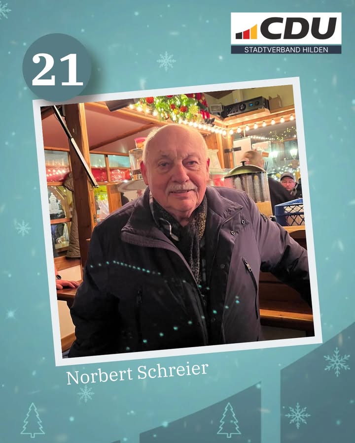 mehrHeute öffnen wir unser nächstes Türchen im Adventskalender. 🎄👉 Norbert Schreier, 82 Jahre alt, gehört dem Vorstand der CDU Hilden an.Er wurde mit dem Wappenring in Gold ausgezeichnet, einer der höchsten Ehrungen der Stadt Hilden. Insgesamt blickt er auf 30 Jahre Ratsarbeit sowie 26 Jahre als stellvertretender Bürgermeister zurück.An Heiligabend steht für ihn in diesem Jahr Raclette auf dem Speiseplan. 🍽️⭐️