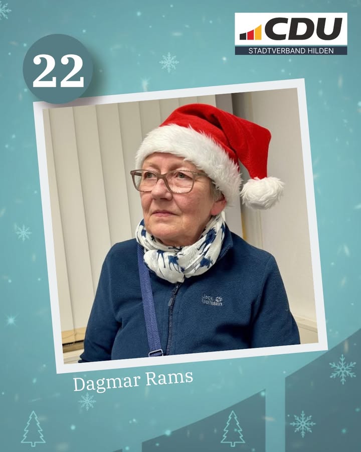 mehrHeute öffnen wir unser nächstes Türchen im Adventskalender. 🎄👉 Dagmar Rams, 68 Jahre alt, ist Beisitzerin im Vorstand der CDU Hilden.An Weihnachten schätzt sie besonders die Zeit mit ihrer Familie sowie die gemütliche Atmosphäre in Hilden zur Adventszeit. In diesen Wochen greift sie außerdem gerne zu bunten Schokoladenkränzen, die für sie einfach zur Vorweihnachtszeit dazugehören. ❄️🎁
