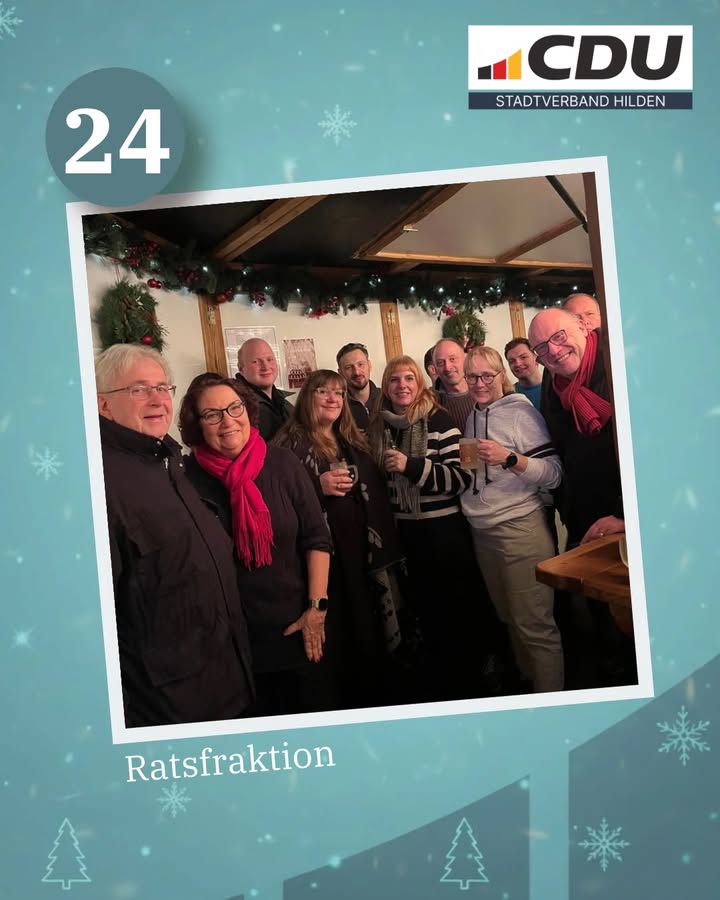 Heute, am letzten Tag unseres Adventskalenders, gibt es keine einzelne Vorstellung, sondern ein Gruppenfoto der CDU-Ratsfraktion Hilden.Gemeinsam wünschen wir Ihnen und Ihren Familien frohe und gesegnete Weihnachten, eine ruhige und besinnliche Zeit sowie viele schöne Momente im Kreis Ihrer Liebsten. 🎄✨Genießen Sie die Feiertage, kommen Sie zur Ruhe und verbringen Sie wertvolle Zeit mit Familie und Freunden. ☺️