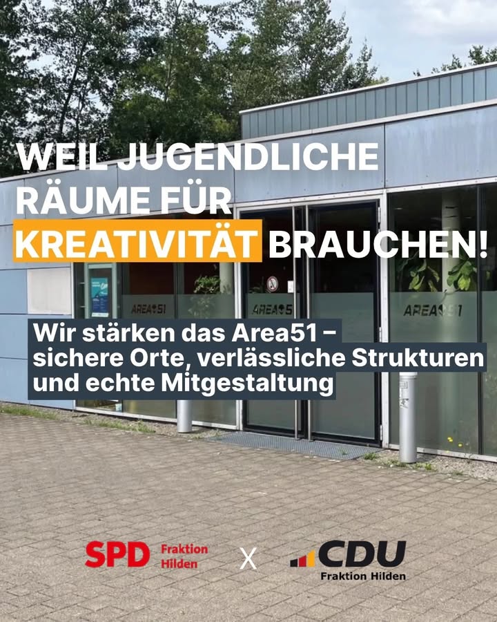 Das Area51 in Hilden ist ein zentraler Ort für Kinder und Jugendliche 🎨🏫💡Hier können sie kreativ sein, soziale Kontakte knüpfen und ihre Freizeit aktiv mitgestalten.Als SPD- und CDU-Fraktion beantragen wir, das Area 51 künftig dreimal wöchentlich zu öffnen und die Einrichtung personell zu stärken. Dazu fordern wir, dass eine Vollzeitstelle für die pädagogische Leitung geschaffen und ein Budget für Honorarkräfte und Veranstaltungen bereitgestellt wird.👉🏼 Kinder brauchen feste Orte und vertraute Ansprechpartner ? ganz besonders in einer Zeit wachsender sozialer, psychischer und familiärer Belastungen. Mit der Aufstockung von Personal und Budgets wollen wir sicherstellen, dass Schutz, Förderung und Beteiligung der Jugendlichen nachhaltig gewährleistet sind. 🤝Wir wollen das Area51 wieder stärken, denn Investitionen in offene Kinder- und Jugendarbeit zahlen sich langfristig für alle aus! ☝🏼