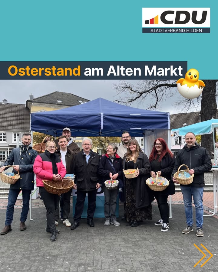 Am Samstag, 09. Mai 2026, ist die CDU Hilden von 11 bis 15 Uhr mit einem Stand auf der Mittelstraße vertreten. Im Rahmen der Ehrenamtsbörse laden wir Sie herzlich ein, unseren Vorstand kennenzulernen und sich aus erster Hand über unsere politische Arbeit vor Ort zu informieren. Sprechen Sie mit uns über die Themen, die Sie in Hilden bewegen. Lernen Sie uns persönlich kennen und bringen Sie Ihre Anliegen ein. Sie möchten sich politisch engagieren? Informieren Sie sich vor Ort über Wege in die Mitarbeit und Mitgliedschaft. Kommen Sie vorbei – wir freuen uns auf den Austausch!
