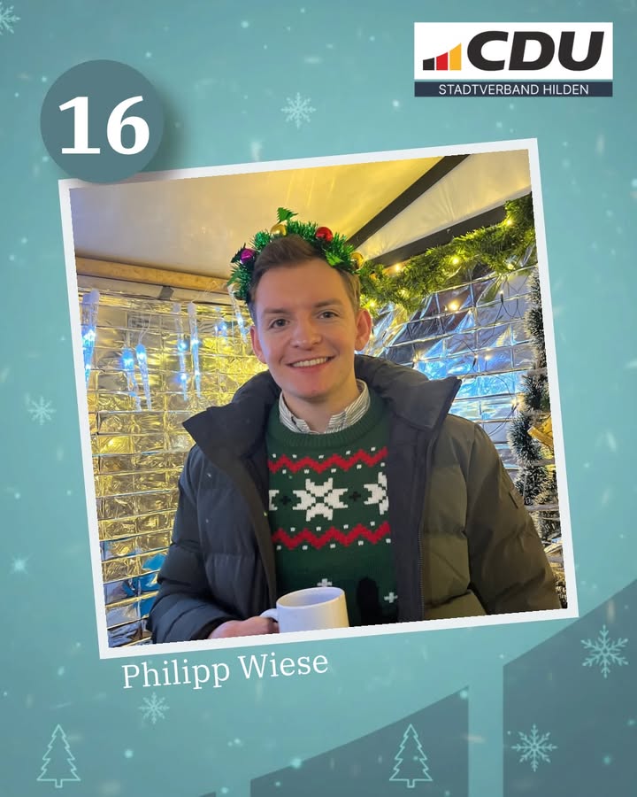 mehrHeute öffnen wir das nächste Türchen unseres Adventskalenders und stellen euch unser jüngstes Ratsmitglied vor. 🎁👉 Philipp Wiese feiert heute seinen 24. Geburtstag ? dazu gratulieren wir ganz herzlich! 🎉Er ist seit diesem Jahr Ratsmitglied der Stadt Hilden und engagiert sich zudem aktiv in der Jungen Union.In der Vorweihnachtszeit greift er besonders gerne zu Zimtsternen und freut sich vor allem darauf, Zeit mit seiner Familie zu verbringen. 🎄