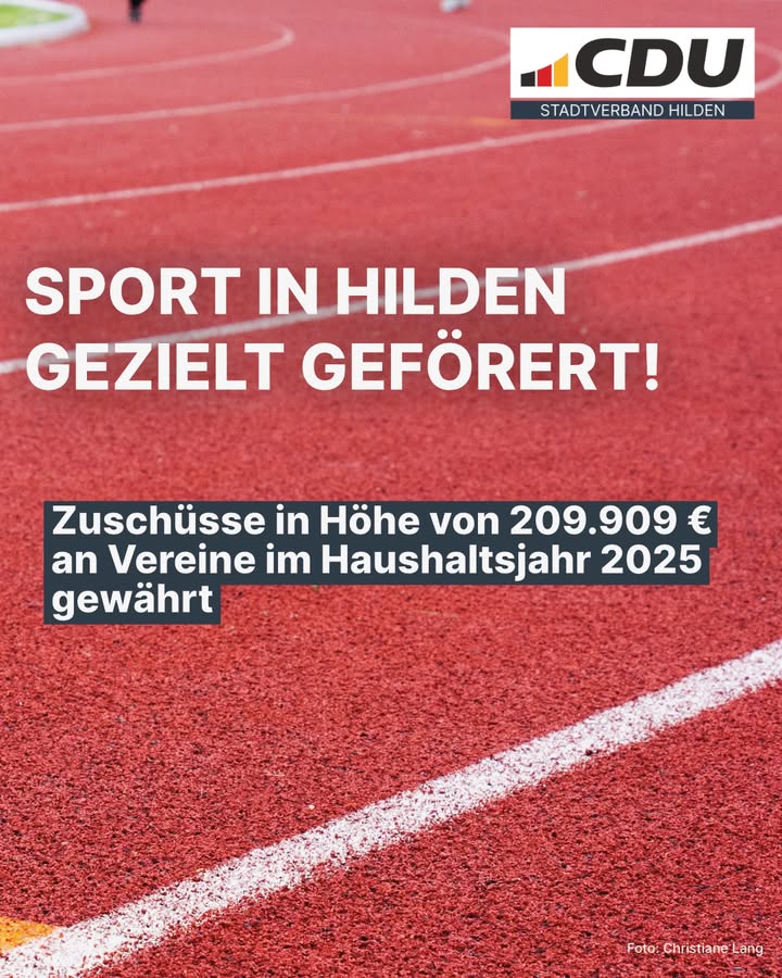 ℹ️ Im Haushaltsjahr 2025 wurden die Hildener Sportvereine mit insgesamt 209.909,34 ? (inklusive der Sportpauschale, exklusiv 176.093,33 ?) gefördert. Der entsprechende Bericht über die im Jahr 2025 gewährten Zuschüsse an Sportvereine wurde dem Schul- und Sportausschuss zur Kenntnis vorgelegt.👉 Für die CDU Hilden ist klar: Sport verbindet Generationen, stärkt den Zusammenhalt und fördert die Gemeinschaft in unserer Stadt. Wir setzen uns dafür ein, dass Vereine weiterhin die nötige Unterstützung erhalten, damit Sport für alle zugänglich und lebendig bleibt. 🏀🏃🏼♀️